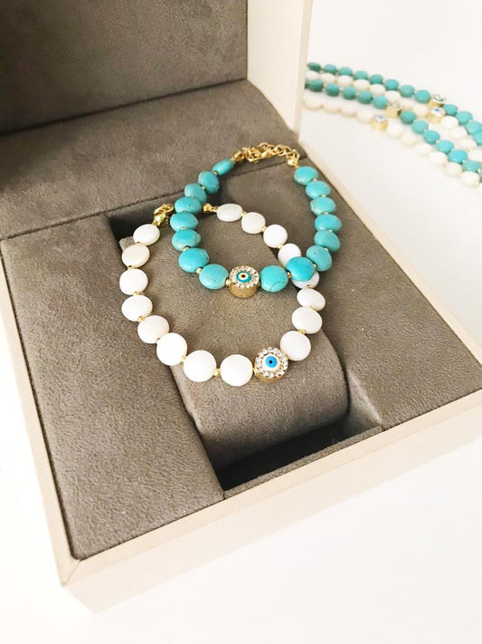 Evil Eye Bracelet, Greek Bracelet, Turquoise White Stone Bead Bracelet