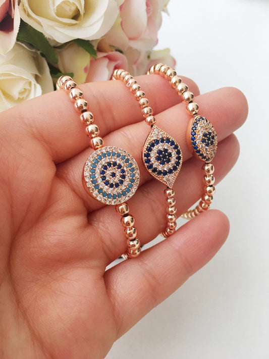 Evil Eye Beaded Bracelet, Rose Gold Adjustable Bracelet